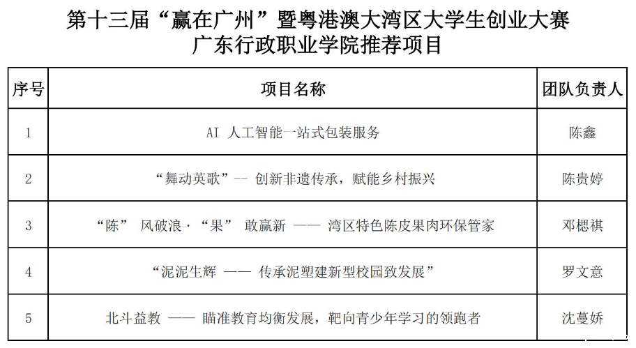 按照广州市人力资源和社会保障局《关于举办2024年第十三届“赢在广州”暨粤港澳大湾区大学生创业大赛活动的通知》及我校《关于遴选项目参加2024年第十三届“赢在广州”暨粤港澳大湾区大学生创业大赛的通知》要求,经学生项目团队报名,我院组织校外专家评审、网上公示等流程,现推荐“AI 人工智能一站式包装服务”等5个项目参加2024年第十三届“赢在广州”暨粤港澳大湾区大学生创业大赛,现对推荐结果予以公告。